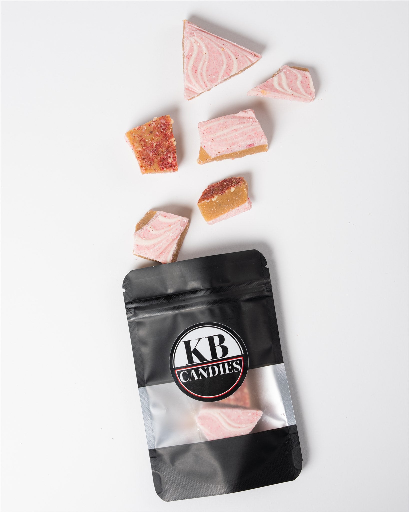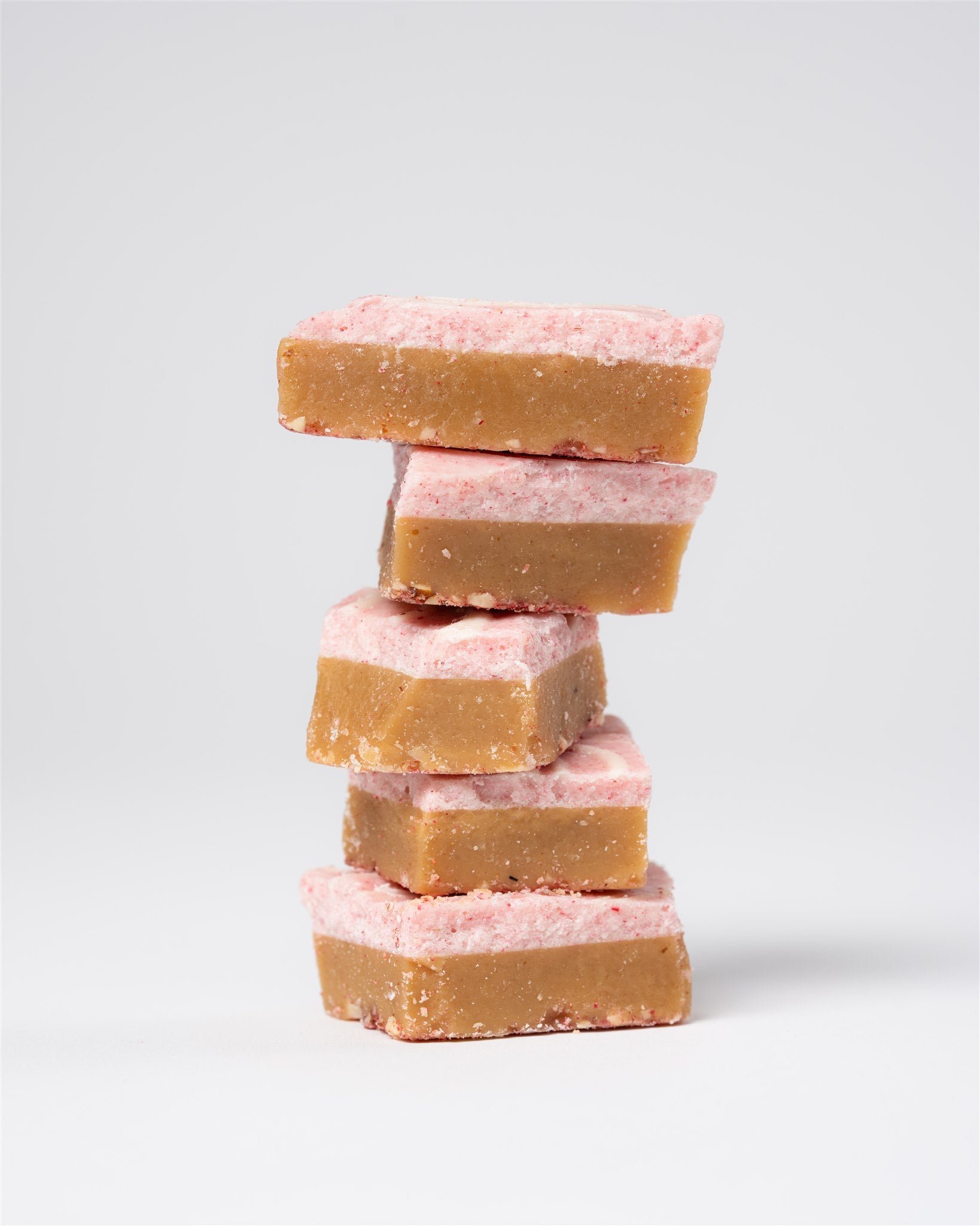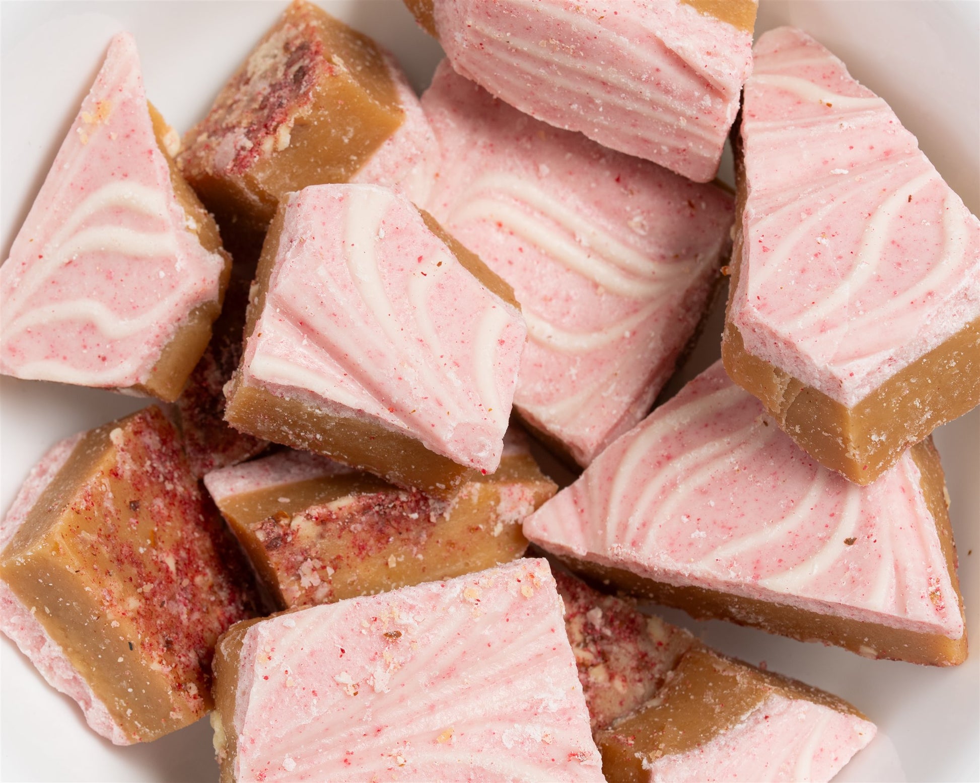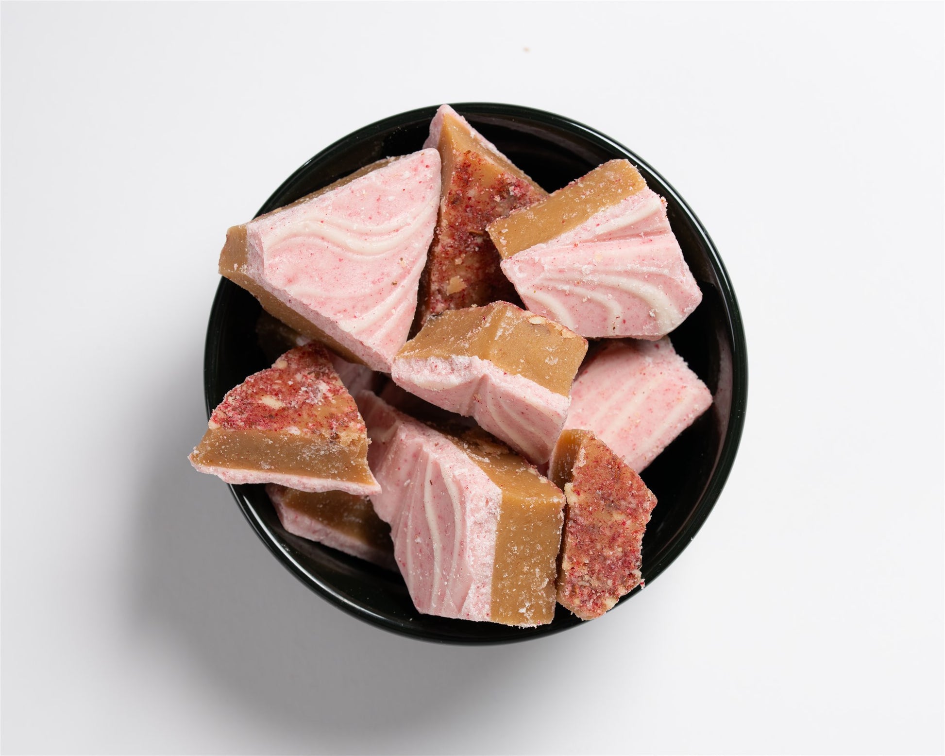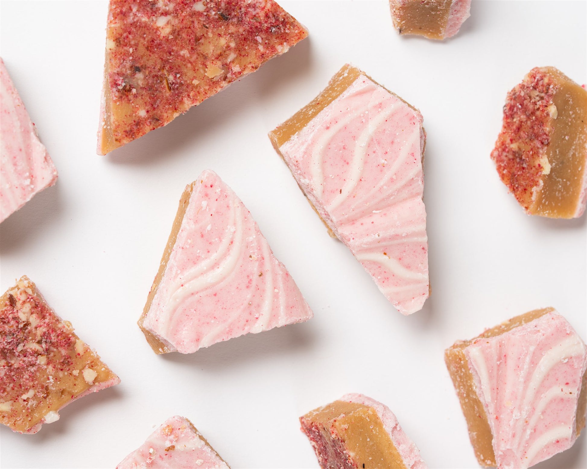 A summery fresh twist on classic toffee, we mix raspberries and creamy white chocolate into a toffee with a soft crunch that’s sweet and tangy in every bite.